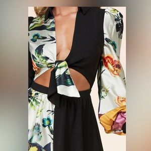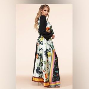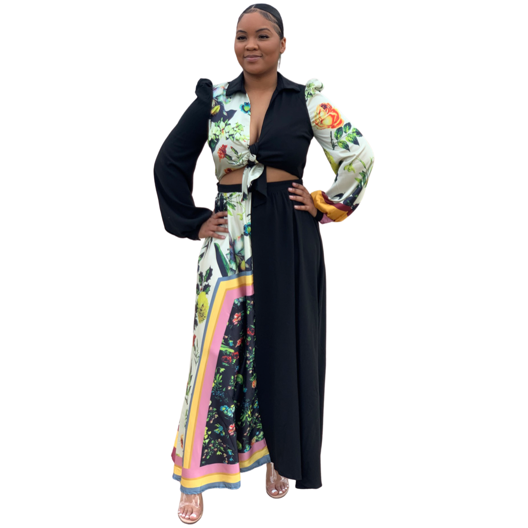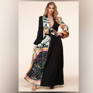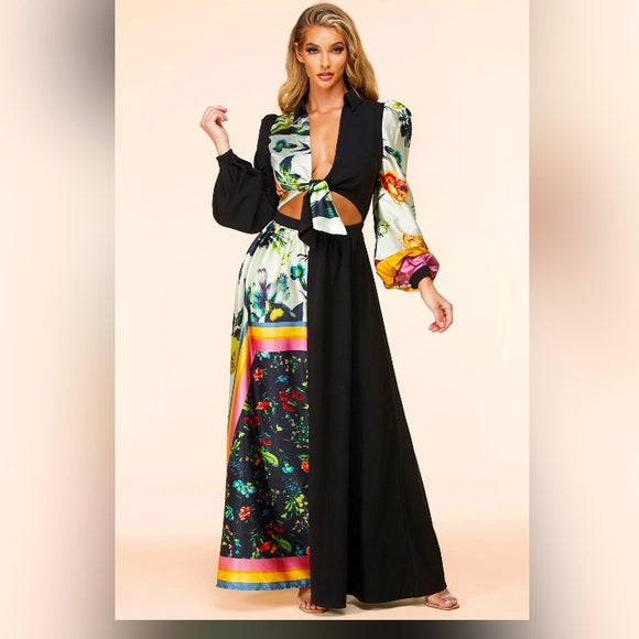 Two tone abstract maxi dress features a plunging tie-front V-neck, cutout at waist, button-down closure on a full-length pleated skirt and elegant lantern sleeve.