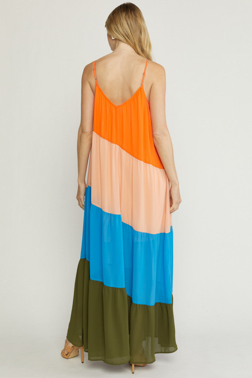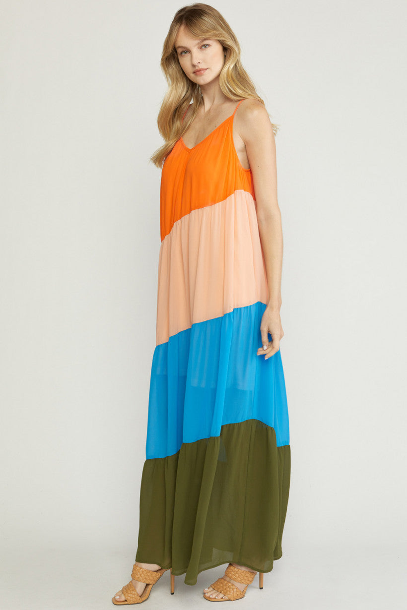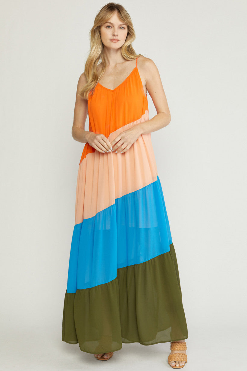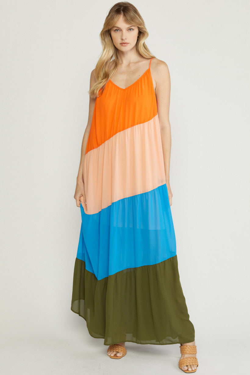 Color block v-neck maxi dress featuring adjustable straps. Lined. Woven. Semi-sheer. Lightweight.