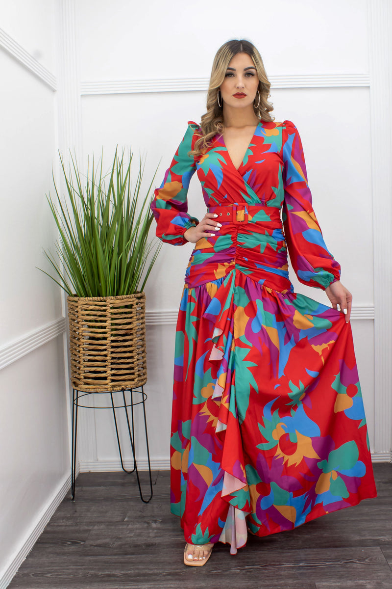 Floral long sleeve ruffled belted maxi dress. Ruching on the waist and elastic on the sides.