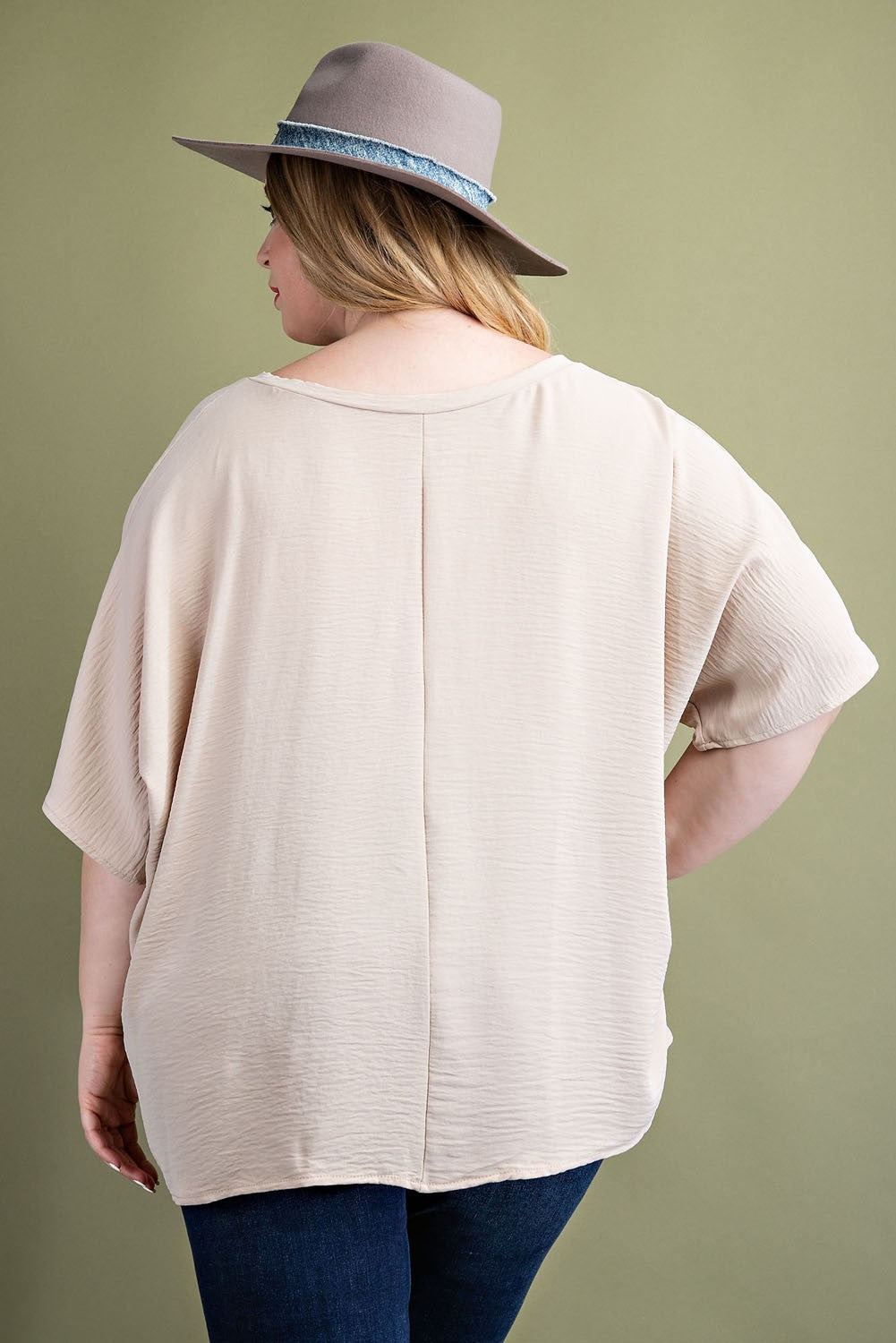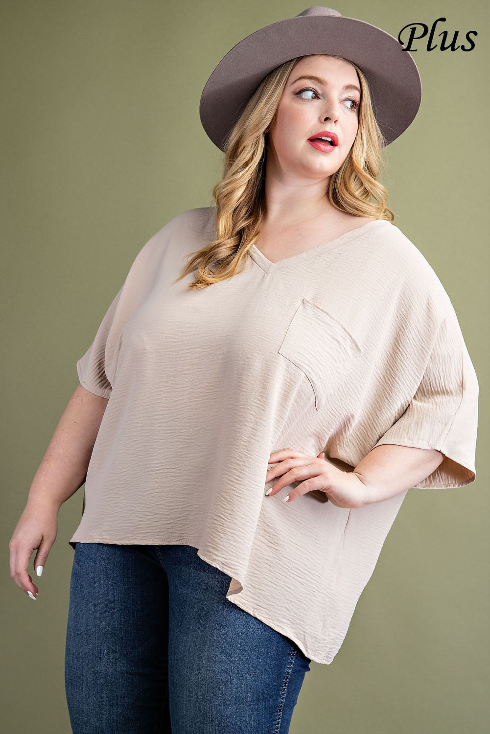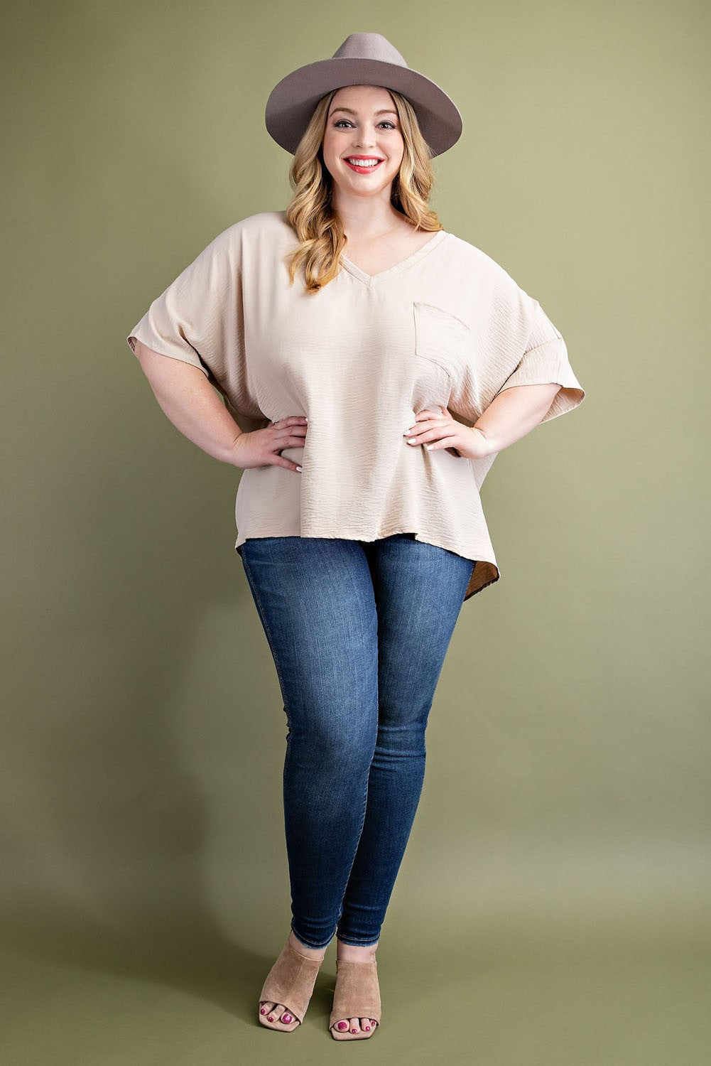 Plus size woven top featuring a V-neckline, short sleeves, and a chest pocket.
