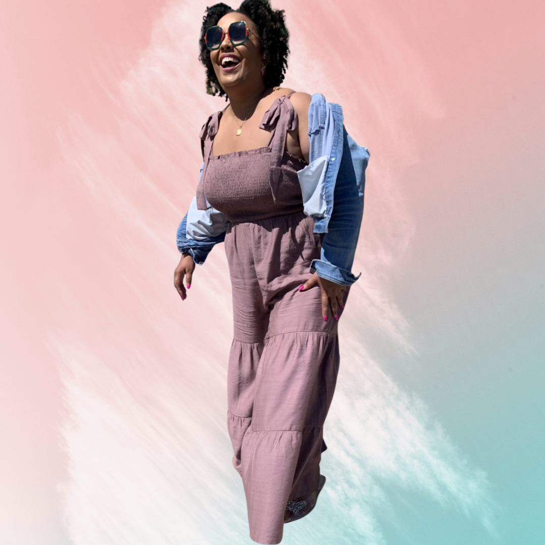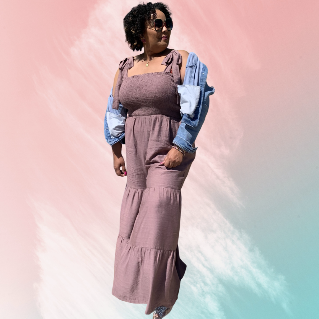 Mauve wide leg jumpsuit with a tiered design plus a body hugging smocked waist. Finished with tie straps