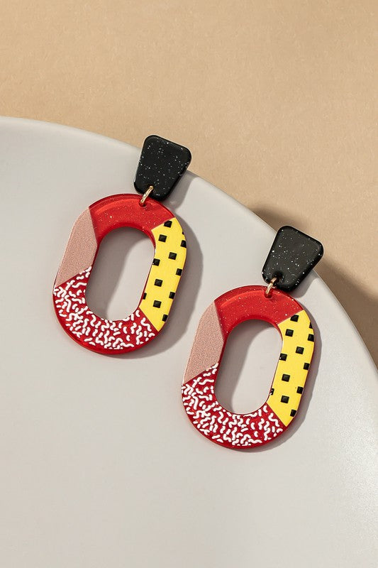 red, yellow and black cutout oval hoop earrings with glitter background and color blocks