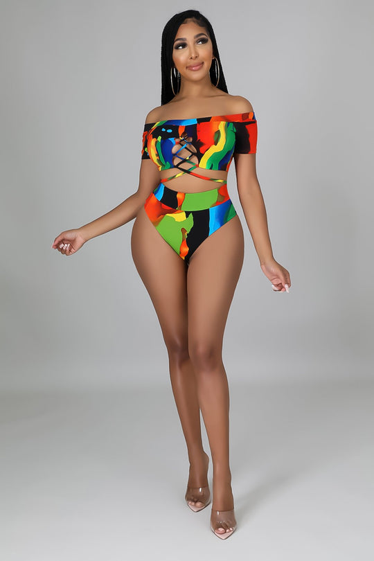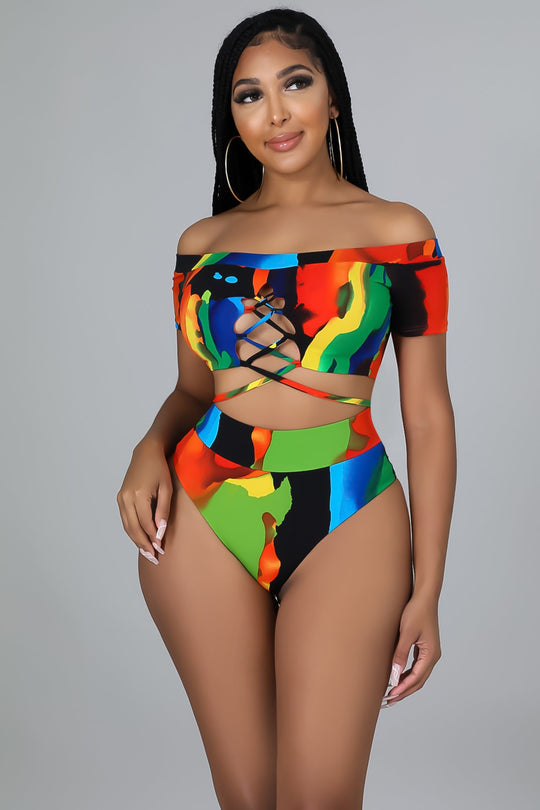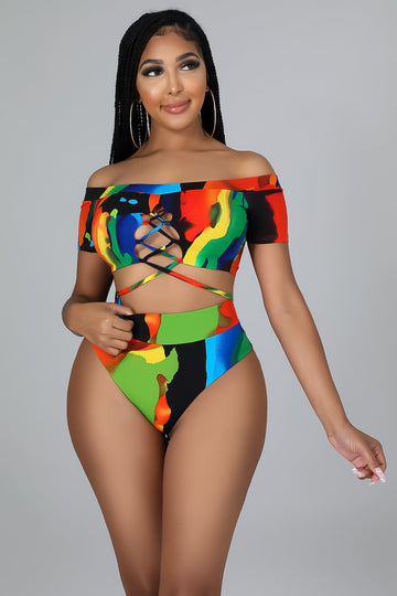 Two-piece swim set with short sleeve off the shoulder top. Lace-up detail am high waist bottoms with elastic waistband